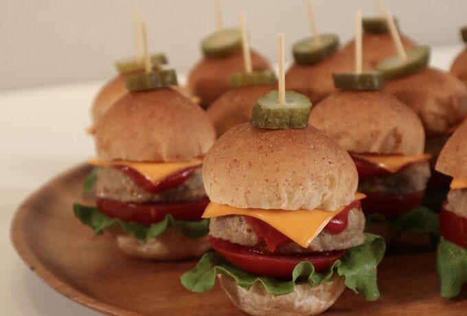 水色ベースの催事ロゴだったため、造花は緑多めにし夏をイメージさせる装飾に。 また、女性のみの懇親だったためお料理はチーズバーガーや手毬ずしなど可愛い見た目を意識しました。 チョコレートブラウニーはお持ち帰りもできるように個包装に。 お客様からも「とても盛り上がりました!」との声をいただきました!