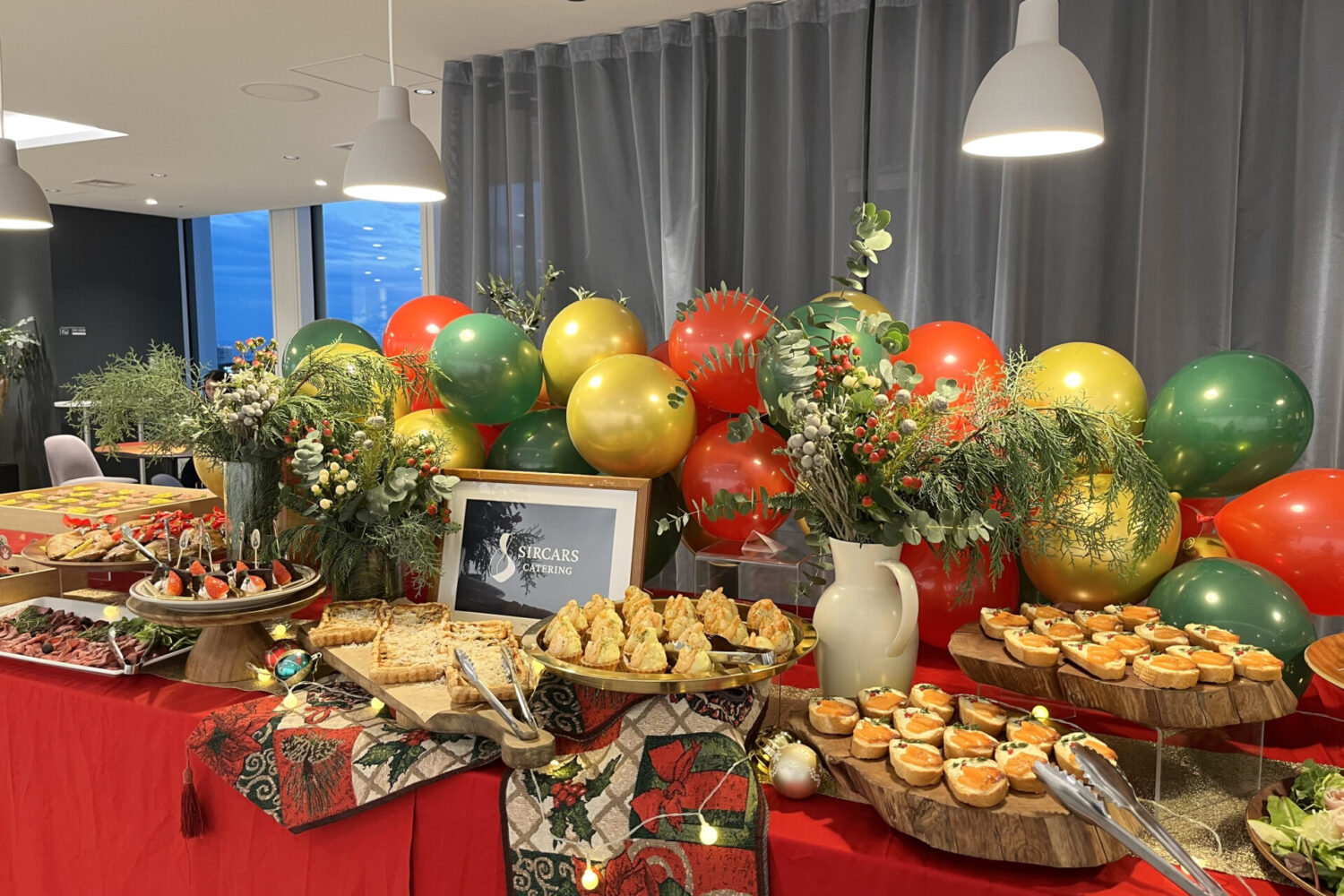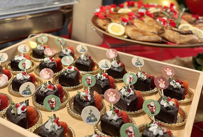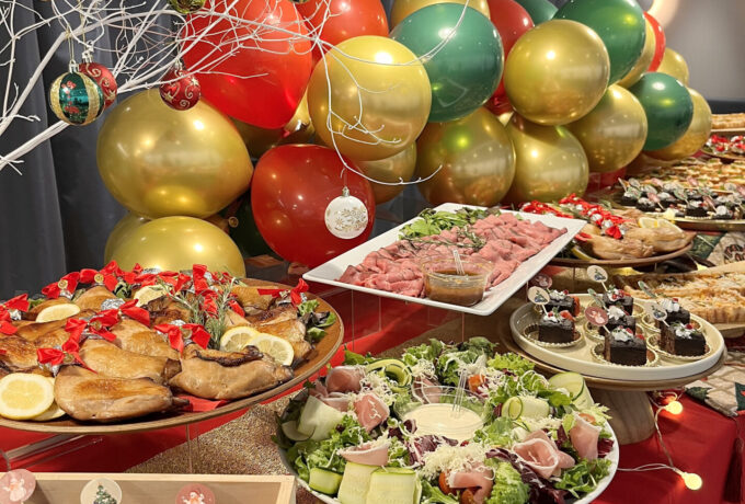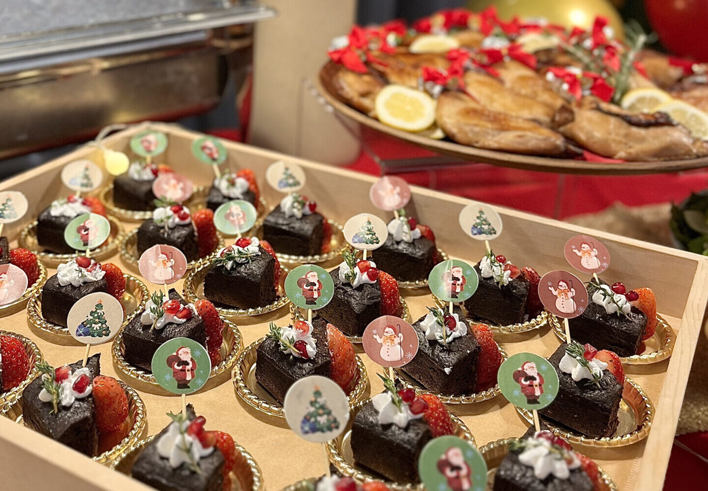 クリスマスのお料理コーディネート お料理はクリスマスらしくチキンやフラッグ付きのブラウニーをご用意しました。 また装飾面では、バルーンやライト、生花を用いておしゃれなクリスマスを演出しました。