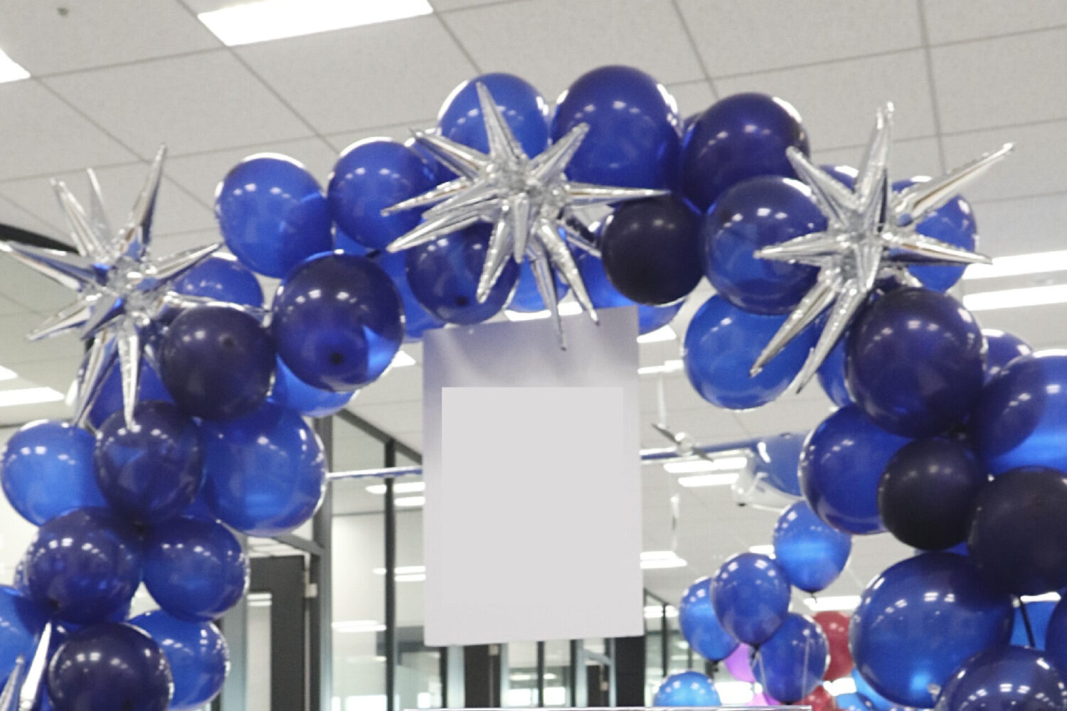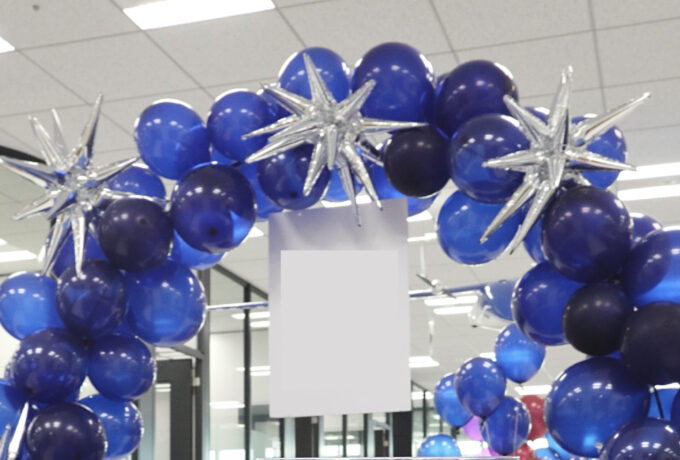 400名様のケータリング 催事カラーのウェルカムドリンクを並べて参加者の皆様をおもてなし。 お料理台はバルーンアーチやテーブルバルーンを使用し華やかに装飾。 またお料理台に加え、ローストビーフやお寿司のLIVE演出を実施し、参加者様に様々なブースでお楽しみいただけた会になりました。