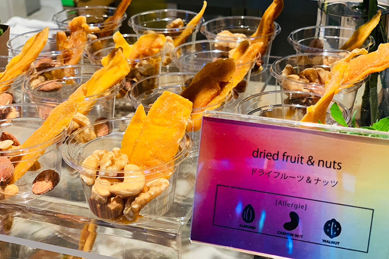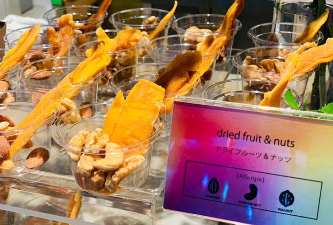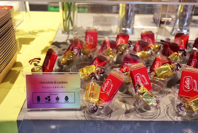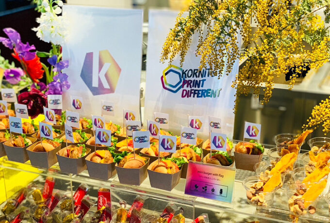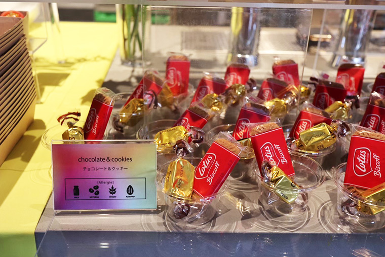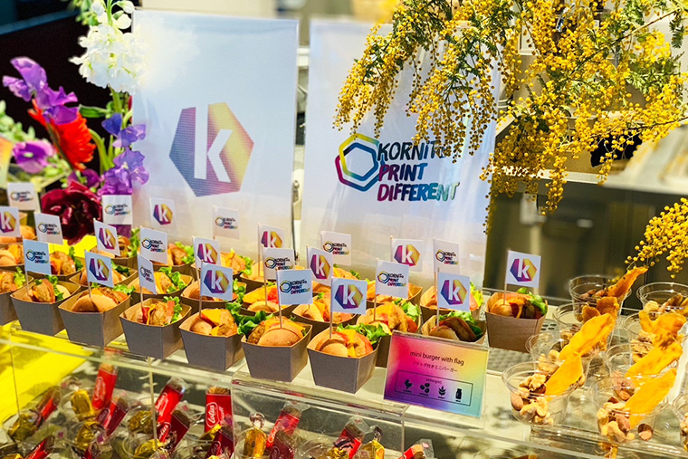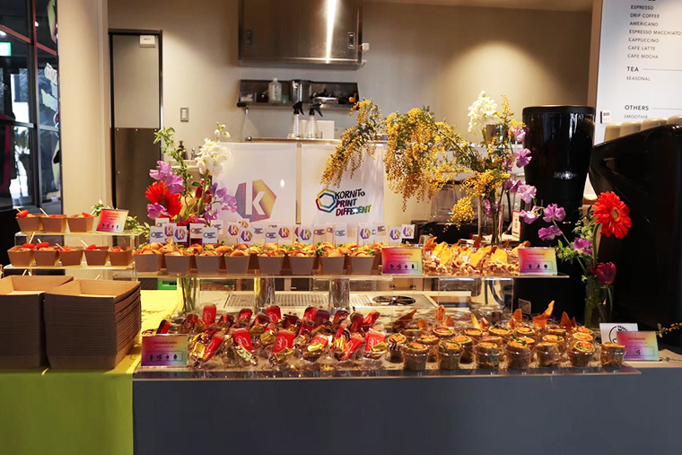 カラフルなロゴに合わせたお花で装飾。海外のお客様だったので、メニュー札には英語を使用。 メニュー内容に関しては、細かくお打ち合わせをしました。全員が食べられるよう、宗教や外国の方の好み、少し日本とは違うメニュー構成が完成し、私たちも異国を味わいながら楽しめたケータリングでした。