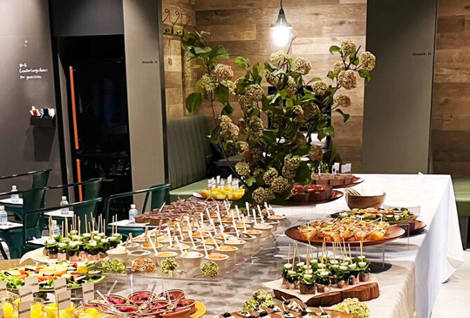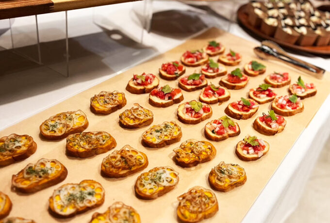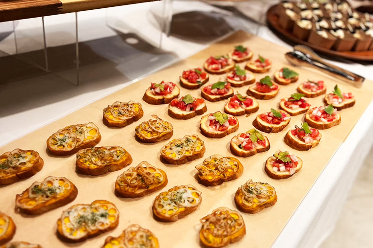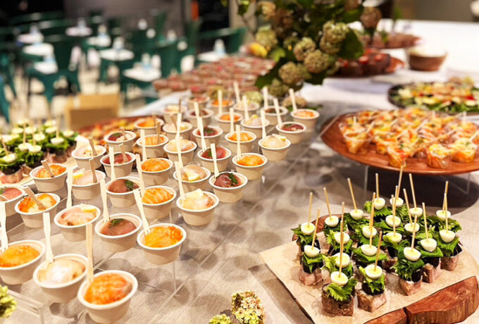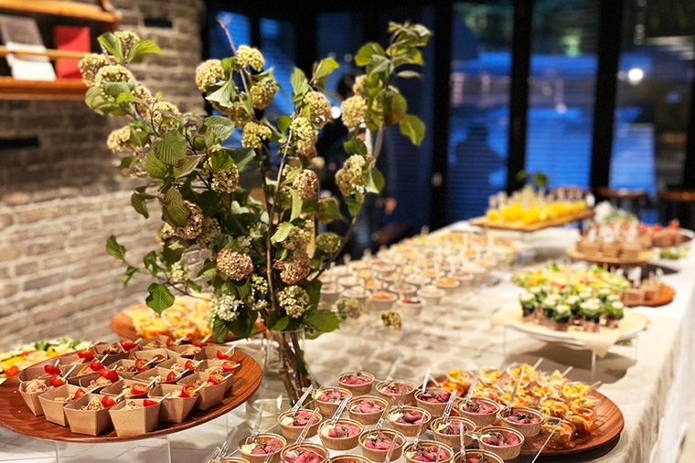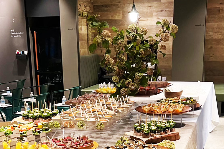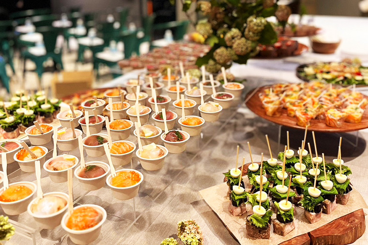 特製牛もも肉のローストビーフや豚肉とナスのピンチョス、白身魚の彩りフリッターなど お肉もお魚も楽しんでいただけるボリューム感のあるメニュー提案。 海鮮手毬寿司は3種類、カナッペは2種類など1つのメニューに対して数種類展開することで お客様に幅広く楽しんでいただけるように工夫しました。
